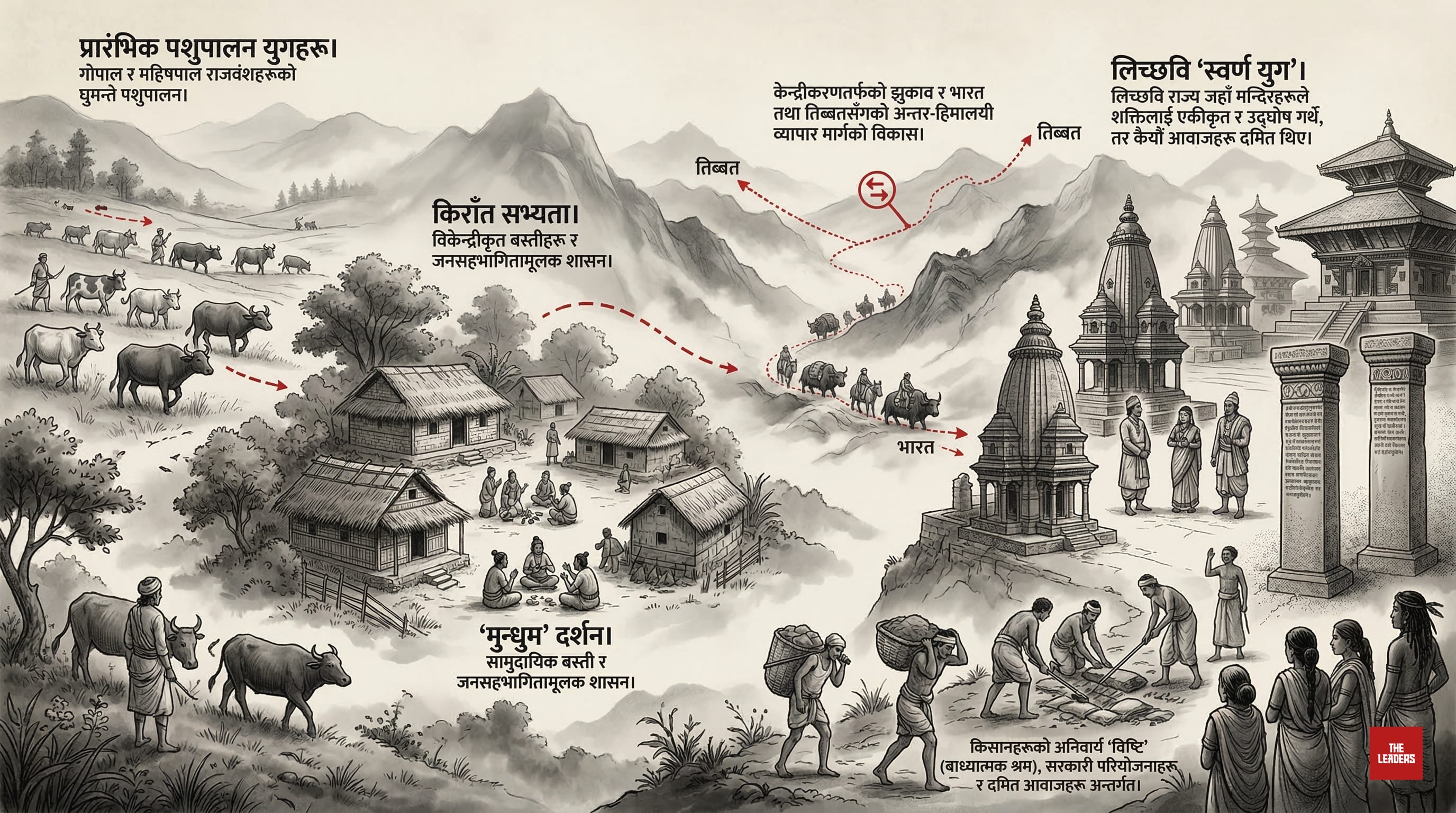 घाँसेमैदानमा गाई-भैँसी चराउने गोपाल र महिषपालहरूको विकेन्द्रीकृत समाजबाट सुरु भएको यो यात्रा, किराँतहरूको मुन्धुमी दर्शन र जनसहभागितामा आधारित कबीला प्रणाली हुँदै अघि बढ्यो। तर जब अन्तर-हिमालय व्यापारले अथाह पुँजी र बाह्य शक्तिहरूको स्वार्थलाई भित्र्यायो, तब राज्यको चरित्रमा आमूल परिवर्तन आयो। त्यही व्यापारिक र सामरिक आवश्यकताले लिच्छविहरूको कडा, केन्द्रीकृत र धर्ममा आधारित राजतन्त्रलाई जन्मायो, जसले कला र वास्तुकलाको स्वर्ण युग त ल्यायो, तर सँगसँगै बाध्यात्मक श्रम, करको भारी र जातीय विभेदको सुरुवात पनि गर्यो।
